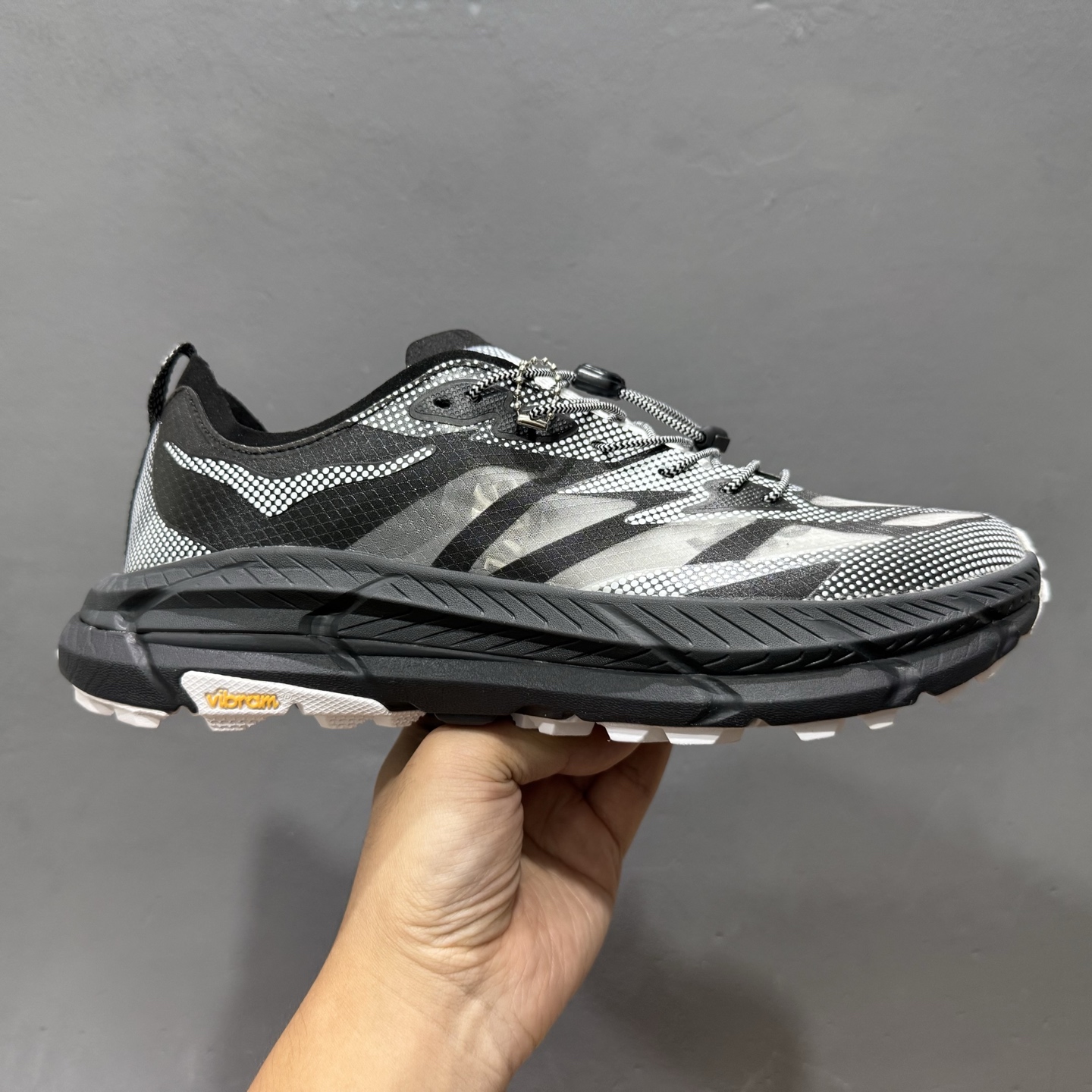 此球鞋继承了HOKA的经典越野鞋型MAFATE SPEED4的设计 更在此基础上进行了创新和提升 使得它既适合户外越野跑,又充满了时尚潮流的元素。它的半透明鞋面设计 不仅让鞋身看起来更加轻便 而且提供了良好的透气性 而保护性的防撕裂尼龙面料,则确保了在复杂地形中的耐用性。