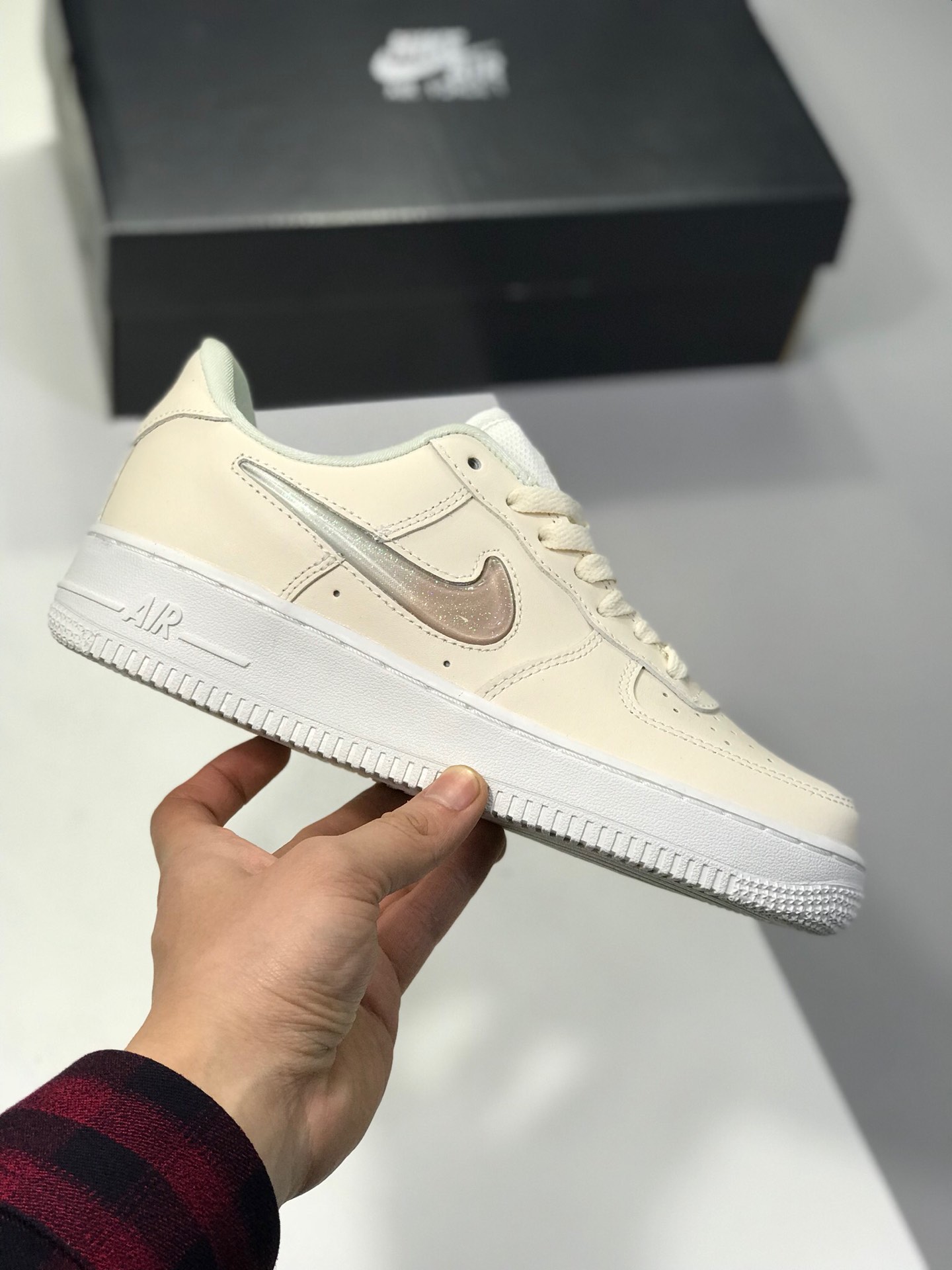 150。 原价:180新版本纯原勾。头层空军果冻NIKE AIR FORCE 1 AF1 空军一号果冻米白女子低帮板鞋 AH6827-100